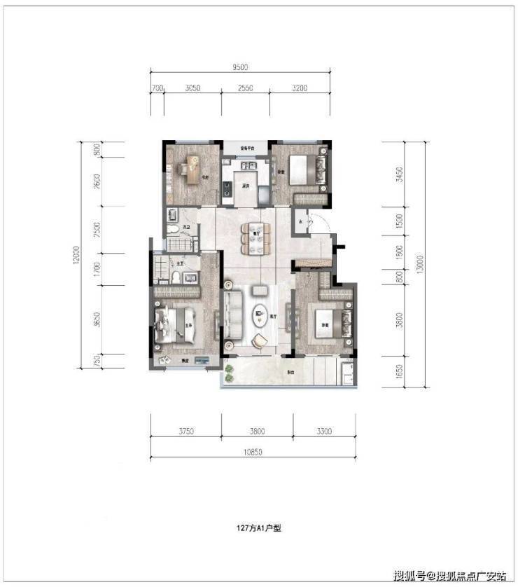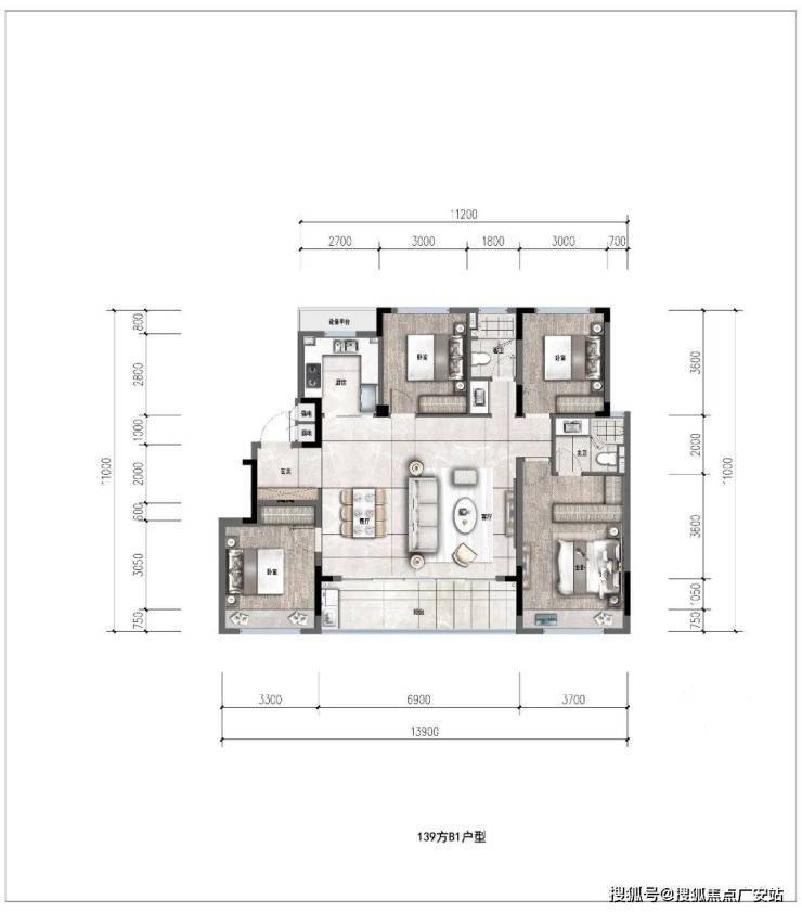 约127㎡经典四叶草户型,全明通透,4个功能间分别位于四角,正好契合了当下注重隐私的居住潮流。