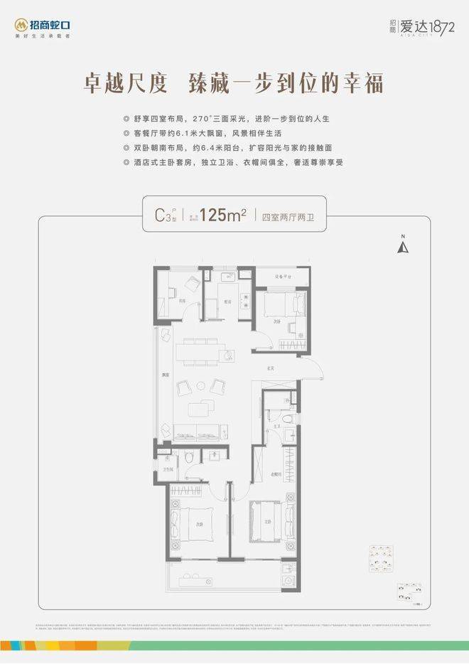 在户型上,其中建面约106㎡户型完美契合年轻人的置业需求,无论是LDKB一体化设计、正三房+双卫的格局,还是约3.5南向大开间、“1+X”创变空间的尺度,都做到了改善级空间感;而建面约125㎡大四房户型则以270°三面采光、奢阔客餐厅、双卧朝南等创新布局,为置业者实现一步到位的生活。