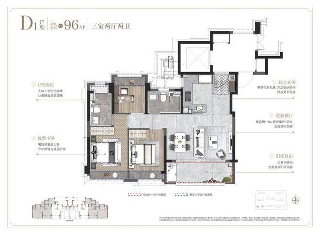 ①建面约96㎡3房户型: