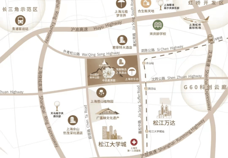 地铁9号线洞泾站约3.2公里、佘山站约3.5公里;三横G50-G318-G60 三纵:G15-G1503-嘉松南路;嘉松南路、沈砖公路、佘天昆路、沪青平高速公路、嘉松公路、沪杭高速等四通八达。