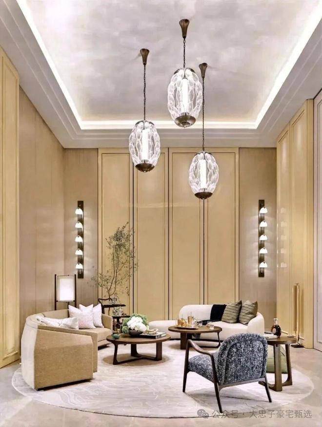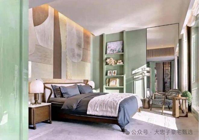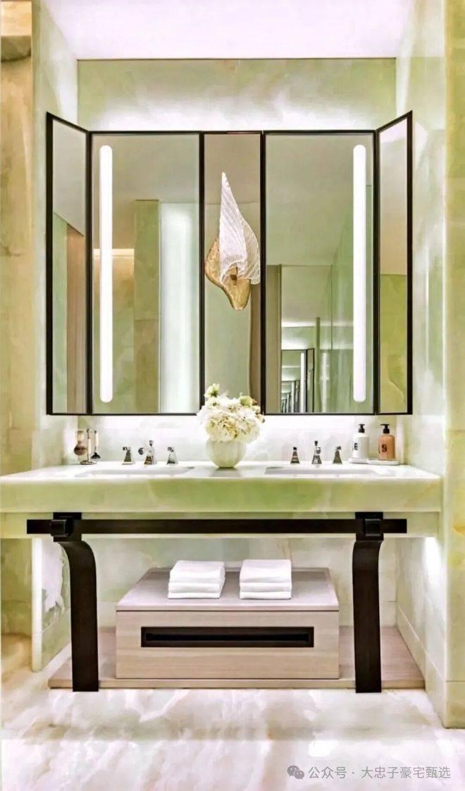 顶层下午茶区以淡绿为底,壁炉暖光漫过手绘地毯的肌理,将社交场域沉淀为冥想容器;主人房墙面缟玛瑙(Onyx)的天然流痕,也与一层屏风暗纹形成时空对位,光影在矿物晶体中生长出私密的诗。