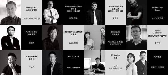 来自中国香港的先锋设计机构10Design和Platform,参与设计上海新天地的日清建筑设计公司,擅长室内空间设计的LSD Interior Design、水平线、Linehouse、NONG STUDIO以及设计外滩建筑群灯光照明的TS lighting等。