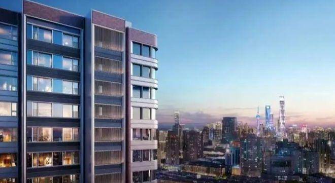 外立面采用Art Deco风格,珍珠蓝铝板+香槟金线条+摩登红元素,顶部钻石切面玻璃幕墙,270°弧形阳台可瞰陆家嘴天际线。