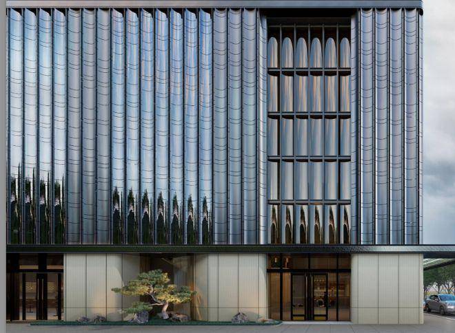 项目会所立面用的流光幻彩铝板,不同角度有不同颜色呈现,“缺点”就是昂贵;大堂的玻璃也很吸睛,用的半钢化夹胶反弯弧玻璃,半径仅为约600mm,施工难度大、成本高,只为更好的效果。