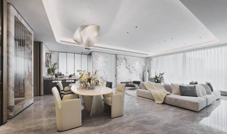 东区建面约320户型,将艺术感进一步融入日常中。特别设计的专属门厅空间,是从电梯厅延伸到家,如同一处艺廊,放慢人的情绪;室内选用了浅金色奢石(外界也称其为“芬迪白大理石”)作为主要的石材,曲面的木饰面也为浅色,整体给人以明亮感。