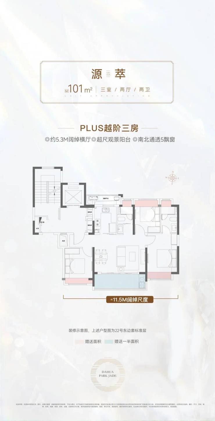 根据介绍,户型得房率75%左右,是“百平米真三房”;主卫面宽做了加宽设计,舒适度提升。