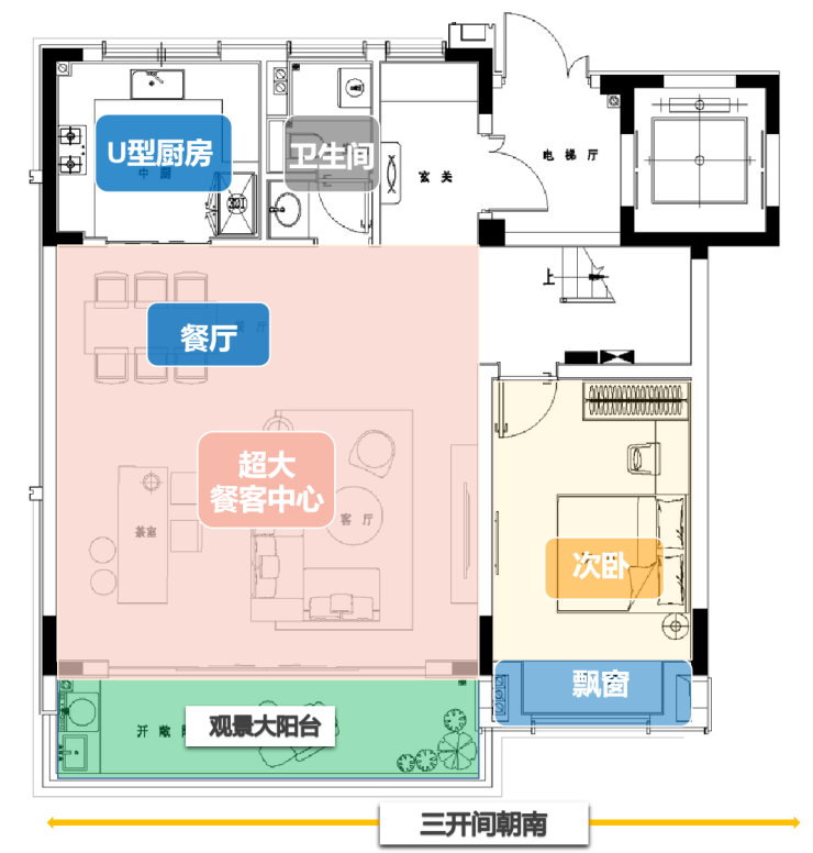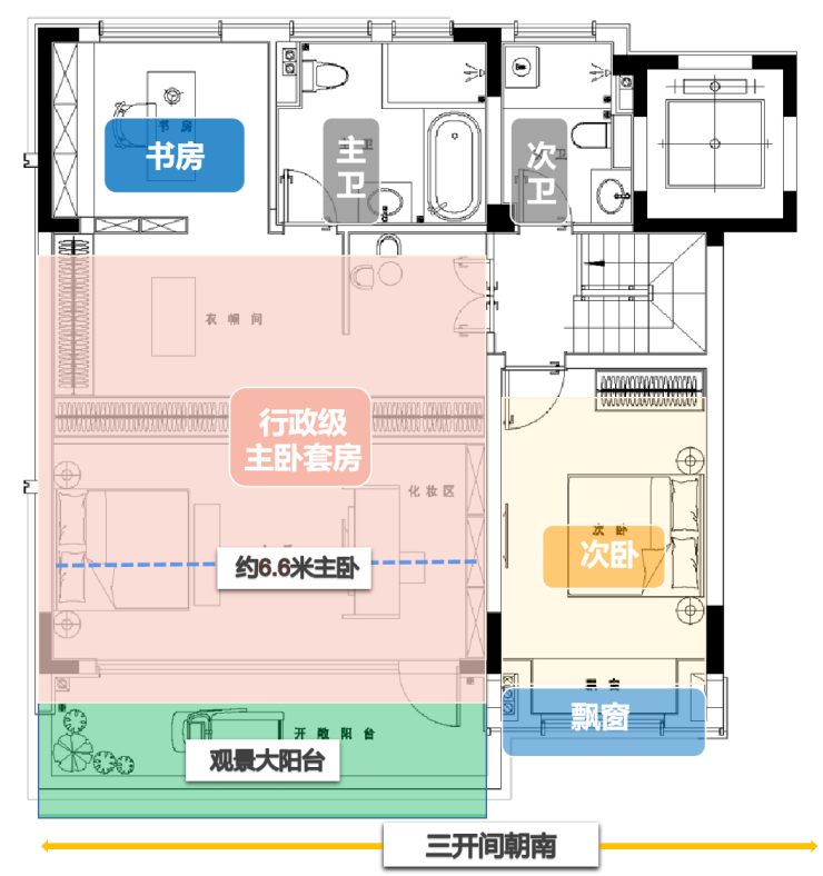 在这套房子里,既有“纵向发展”优势:每一区域都能呈现出不同的功能划分,可以很好解决三代同堂、作息不同、互相干扰的问题;