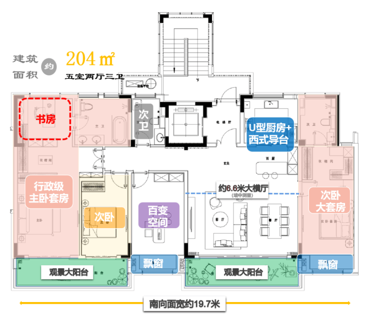 从具体户型看,这个“+1”,建面约204㎡五室两厅三卫设计。