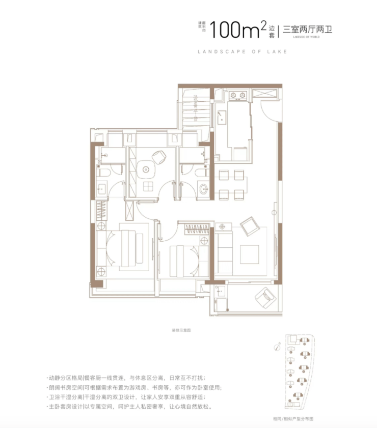 三开间朝南+主卧套房设计+动静分离+全卧室带飘窗,功能性和尺度感完美结合的3房,能满足业主从二人世界到三口之家,再到二胎家庭的全生命周期需求。