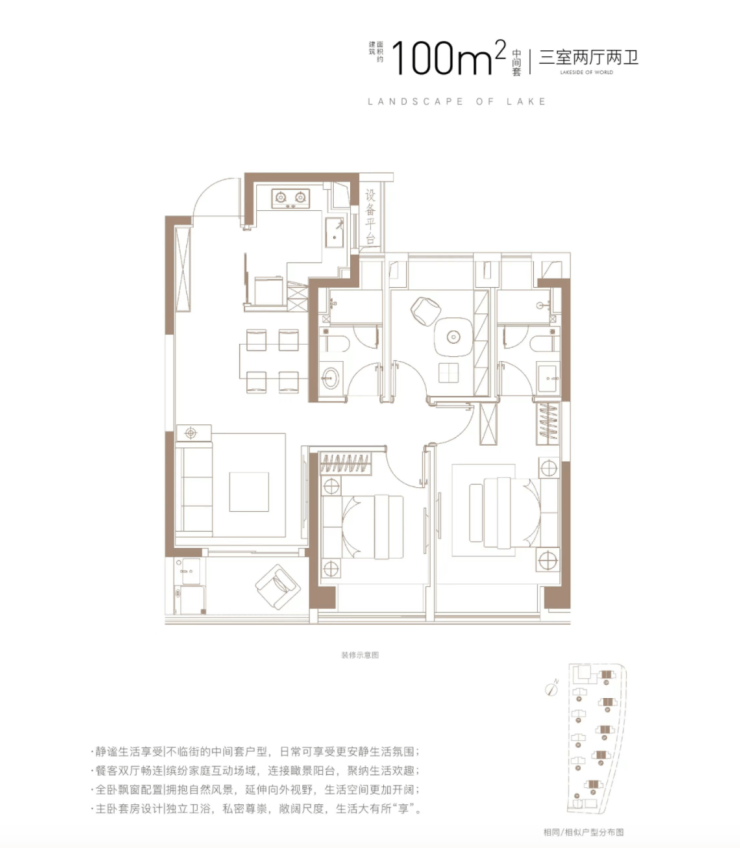 建筑面积约100㎡3房2厅2卫(中间套),全卧飘窗配置,延伸向外视野,拥抱自然风景。而大进深的阳台空间,除了可以满足基本的洗衣晾晒以外还可以日常养花喝茶,实现更多元的生活享受。