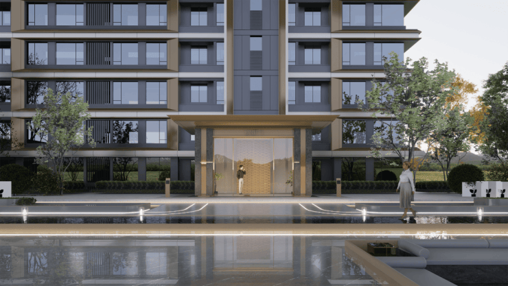 外立面方面,项目汲取广富林文化精髓再造东方屋宇,采用渐暖色石材、银灰色及香槟色铝板和涂料的组合,带来厚重与轻盈的平衡,在彰显文化豪宅的同时又包含国际风骨,整体呈现诗意东方之美。