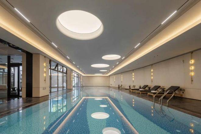 会所核心区是恒温泳池,也是东方疗愈泳池,更是颠覆传统社区泳池的设计逻辑:池底与内壁满铺蓝色玻璃马赛克,粼粼波光中与宋韵建筑的线条遥相呼应,雅致中透着顶奢质感;更难得的是其一体化设计——大幅落地玻璃窗将泳池与下沉式会所中庭景观无缝衔接,游泳时抬眼便能望见庭院里的东方绿植与光影流转,室内的静谧与室外的生机交融,这种“室内外场景一体化”的营造,正是顶奢酒店引以为傲的设计精髓;