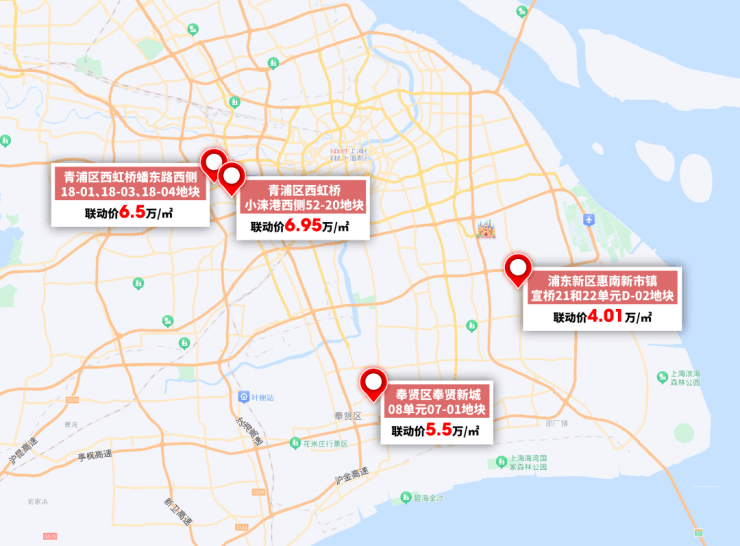 这些宅地中,惠南距离轨交很远、并且整体地段也并不出色,所以联动价只有4万+。但其余的低密地块中,即使是奉贤新城,也有约5.5万/㎡的联动价。徐泾的低密住宅,联动价更是逼近7万。