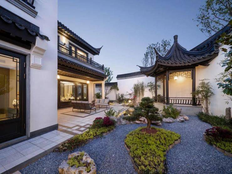 设计风格:飞檐黛瓦、镜湖水景,融合智能家居,独创“院中有山”立体空间3。