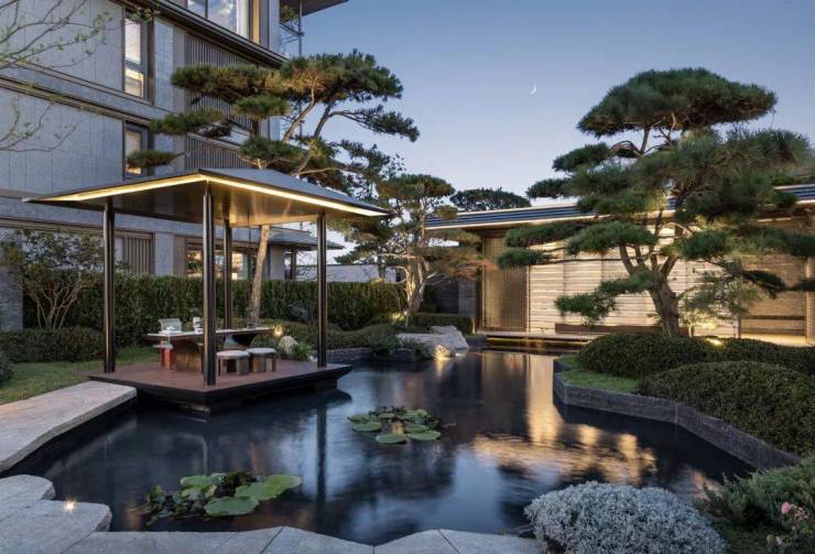 庭院的选材也极具讲究:太行山金景石堆叠成小山丘,岭南古桩铁冬青与中华原生乌桕树移栽而来,蕴含“聚财守业”的美好寓意。细节之处,经得起推敲,让人越看越有味道。