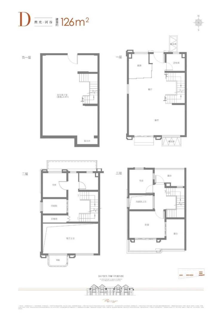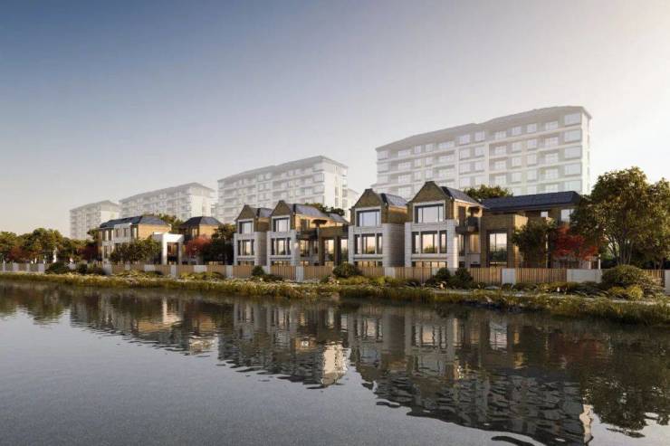 项目容积率仅约1.5,由3层联排别墅+10层墅境平层组成,整体环河排布。