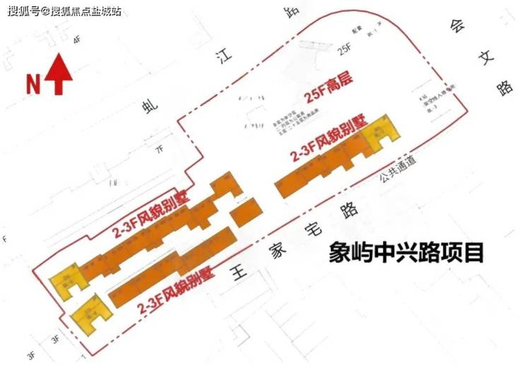 根据规划,项目拟建高层公寓+风貌合院别墅产品。高层为一栋25层高建筑,5-25层为商品房,一层6户,共126套,均为建面约100㎡小三房,该项目综合容积率2.67。