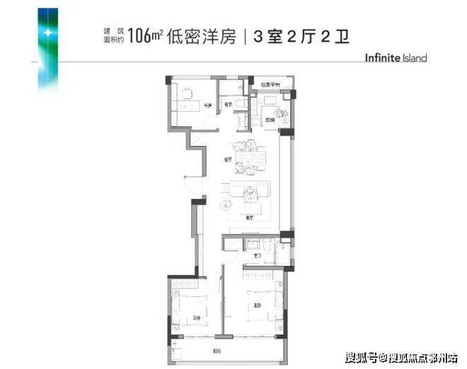 建面约106㎡的户型是市场上难得的小户型边套产品,南向双开间,同样的双联阳台打造,餐客厅一体化设计链接阔景飘窗,充分保证整个房间的采光面,后期居住舒适度更高。