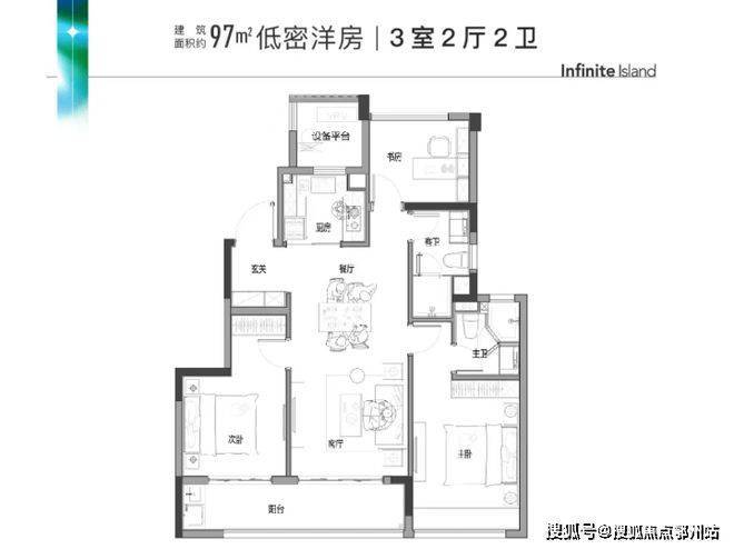 建面约97㎡起步户型,三房两厅两卫格局,南向三开间,次卧与客厅的阳台相连,打造大尺度的双联阳台,还有很大的亮点就是玄关设计,可以很好地护好后期业主的隐私。