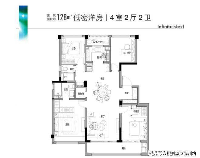 建面约128㎡户型为四房两厅两卫,该户型最大亮点是超高的得房率,也是最受市场欢迎的“四叶草”户型,四个卧室互不打扰,充分保证后期的生活隐私。户型尺度上也同样阔绰,近7米的双开间阳台,2.7m宽的U型厨房,每一个小空间内都可以承载很多的生活场景。