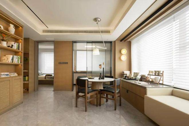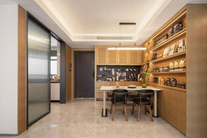 前排一线湖景楼幢,约12.4米超大面宽、四开间朝南。实体样板房的餐厅在做了双排餐边柜后,座位依然阔绰。厨房也非常自信的放入了双开门大冰箱,对喜欢屯各种生鲜食品、饮料的年轻人来说真是心头好。