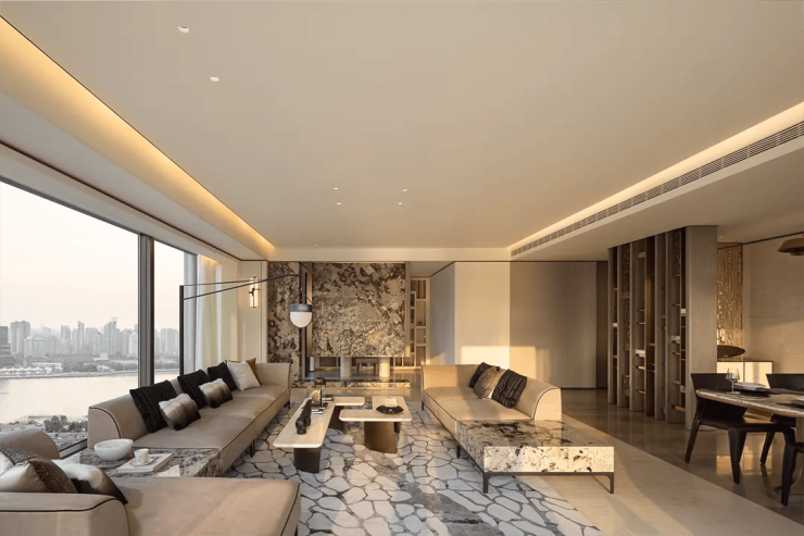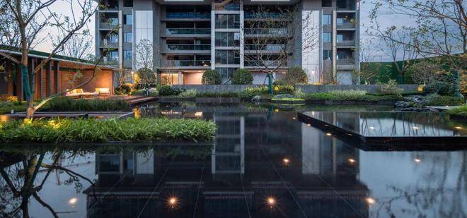 从园区入口到园区景观、建筑外立面、架空层、单元入户,再到样板房...几乎就是一场360度呈现的产品力「环幕大片」。因为南临一线东沙湖拥有得天独厚的水系自然资源,项目景观借鉴曼谷四季酒店设计灵感,在社区人行入口、中央景观、核心节点区域铺陈多处水景,将整个小区打造成一座“微缩的东沙湖”。