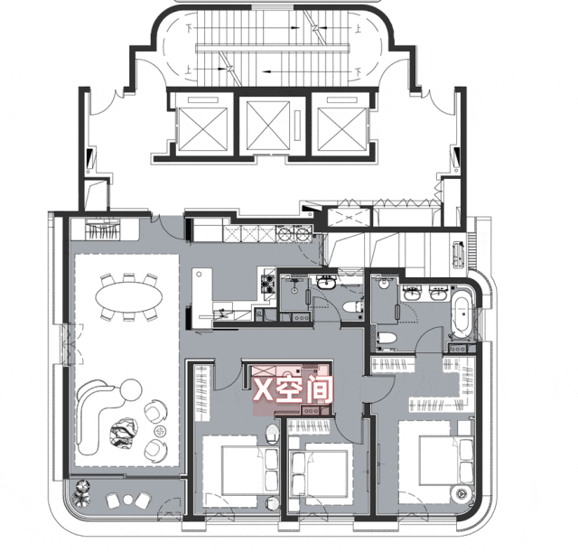 在功能空间的尺度上,整个客餐厅面积达到了约40㎡,主卧套房则拥有约30㎡大空间,足以媲美市面上建面约240㎡的产品。