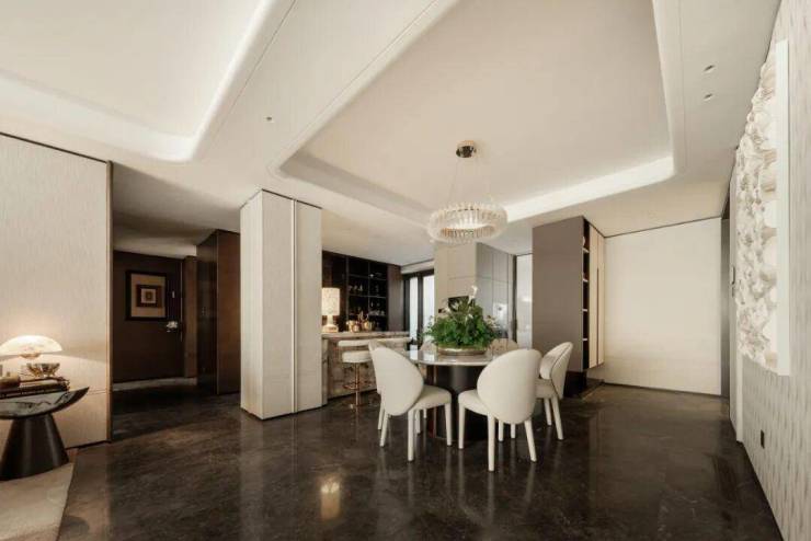 The initial encounter with etiquette features a cast steel mother-and-daughter door paired with an embedded glass door lock, revealing the door lintel; the entrance area is adorned with Milky Way Gold and the Starlight Gray marble of the living room, jointly presenting a hazy ink-wash painting to appreciate the international Eastern aesthetic.