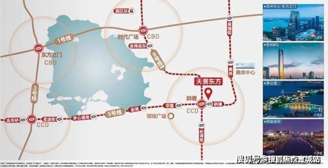 双轨交汇黄金四角环湖四轨交汇,缔造金鸡湖黄金四角,西北-东方之门、东北-时代广场、西南-李公堤、东南斜塘老街一黄金四角所在核芯价值所向.