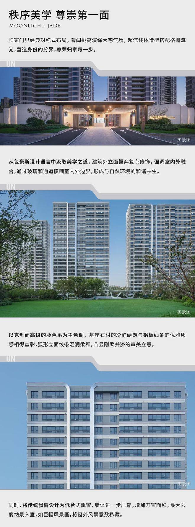 品质:纯人车分流设计,外立面采用石材干挂+铝板,楼间距最宽达150米