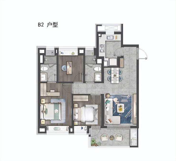 高层99㎡三房两厅两卫(中间套)样板间户型