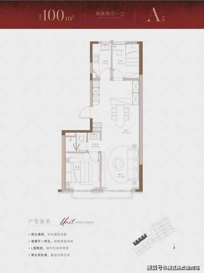 建面约100m²大2房户型,带来的不仅是方正的布局,也为购房者带来了体验感超绝的视野和采光。