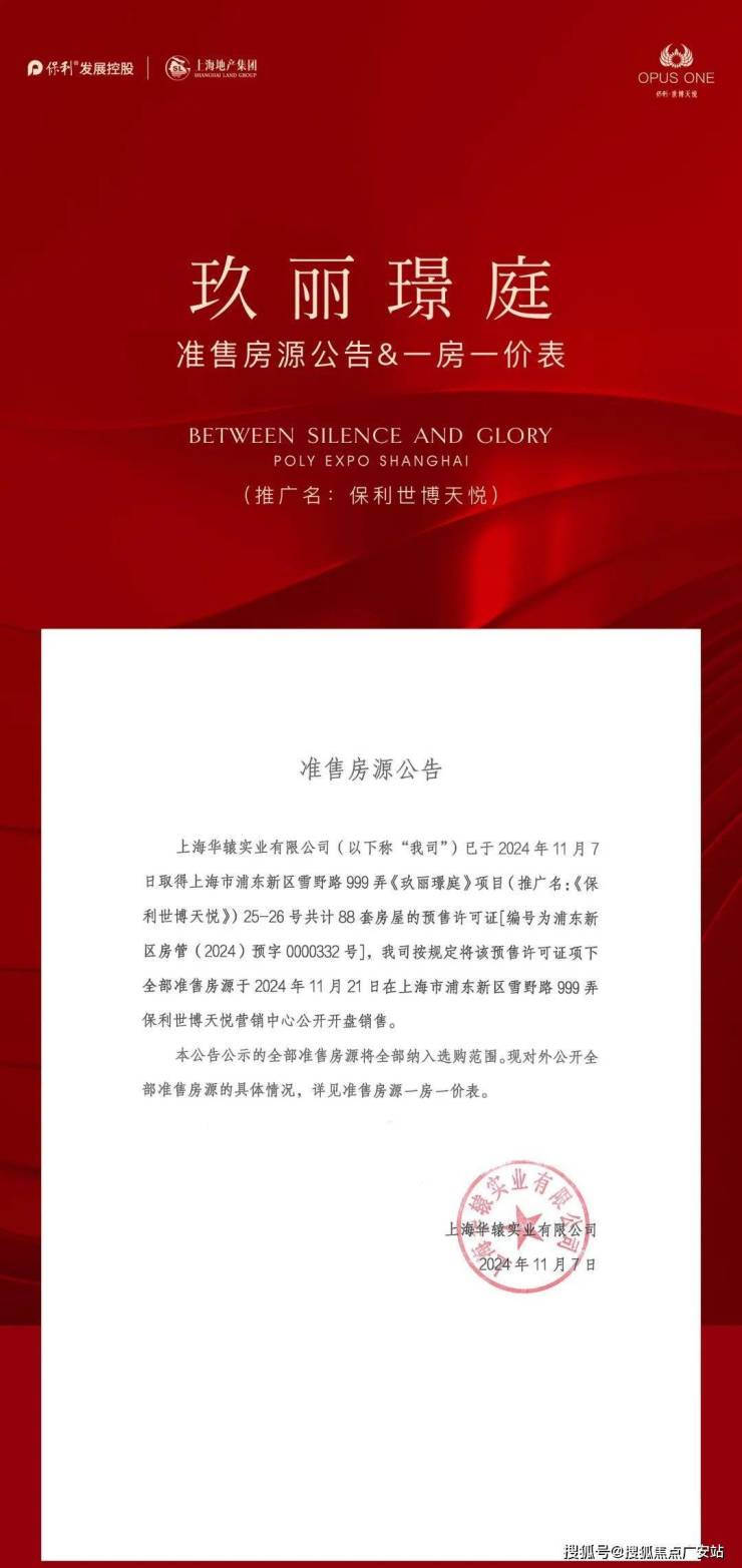 1、项目推广名为“保利·世博天悦”,地名核准名/备案名为“玖丽璟庭”,开发公司为:“上海华辕实业有限公司”;预售证号:浦东新区房管(2024)预字0000398号;2、本资料为要约邀请,不作为要约或承诺;3、相关宣传内容不排除因政府相关规划、规定及出卖人分期规划、未能控制等原因而发生变化;4、买卖双方的权利义务以双方签订的商品房买卖合同及其补充协议、附件等书面文件为准;5、本宣传材料所涉及户型仅供示意参考,具体以政府部门最终审定的图纸和销售合同为准,本资料所涉及面积皆为预估面积,相同户型单位因楼栋、楼层、单元等差异,局部结构、形式、面积、装饰等可能有所不同,且预估面积与实际面积可能存在差异,面积最终以房管局测绘为准。户型图中装修、家具、电器等设备仅为示意,不属于交付内容和交付标准,实际部品的选型和房间空间尺寸根据户型情况,略有差异,以现场实际为准;6、本宣传资料中涉及的价格、折扣、付款方式等信息,因销售时间、户型楼栋、楼层、方位等不同有所差异,以双方签订的商品房买卖合同及其补充协议、附件等书面文件为准;7、本资料所发布的内容为2024年12月的信息,敬请留意最新资料。