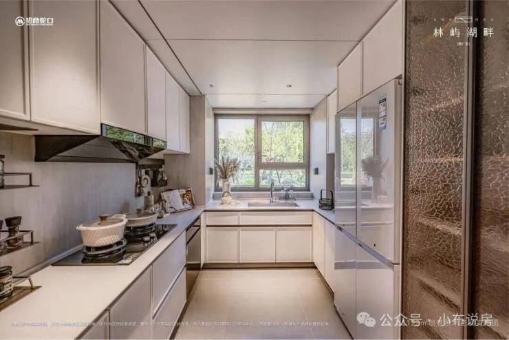 U型厨房借用飘窗,带来远超普通户型的操作空间,可收纳锅碗瓢盆、五谷杂粮,吊柜安装天使拉篮方便拿取;方太三件套,更适应国人的烹饪习惯。✅✅招商林屿湖畔售楼处电话:400 - 9016 - 520✅✅