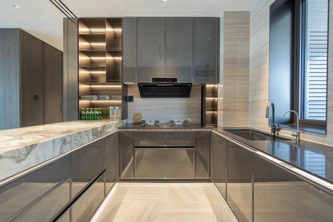 比如墙面采用大量的安第斯雪景奢石和深木饰面,客厅地面铺设欧亚白奢石菱形错拼,客餐厅贴脚线是金属不锈钢材质,将高级感渗透到生活的每个角落。