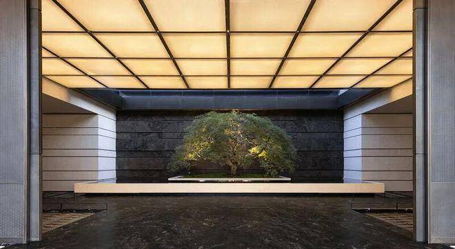 在近人尺度使用沉香米黄石材,以石材的厚重与质感彰显归家的仪式;2层以上采取仿石铝板,以几十种花纹进行拼接,模拟石材分缝,形成方正有序的凹凸进退关系,强化立面的光影效果,既有石材的质感,又实现了更强的外立面造型。