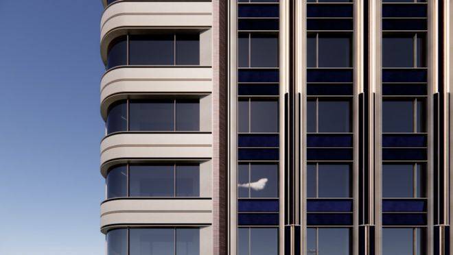 采用大量弧线工艺,包括转角玻璃阳台、弧形铝板、墙面线条和大门线条等,致敬了邬达克装饰艺术派的设计美学。