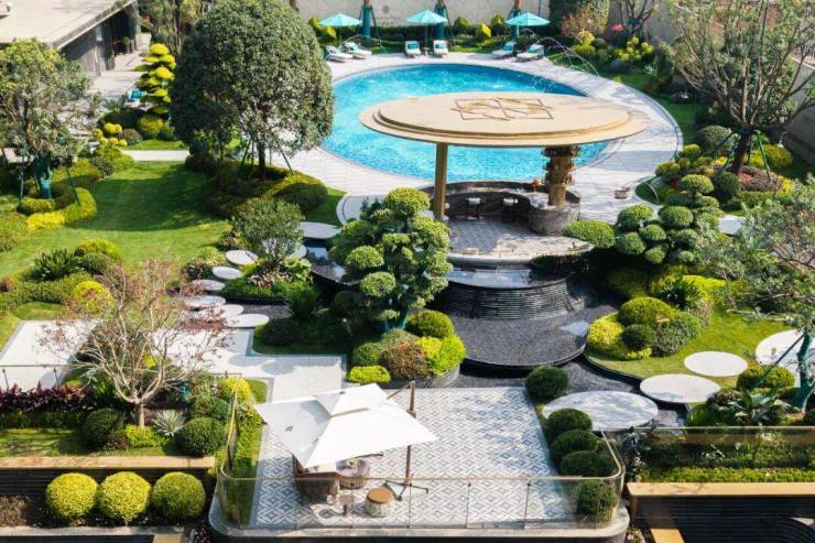 让小胖印象最为深刻的是那个下沉式庭院:树木都是非常浓密的那种,一看就“很贵”,而且几乎每一棵都有“专属花盆”,修剪的层层叠叠。
