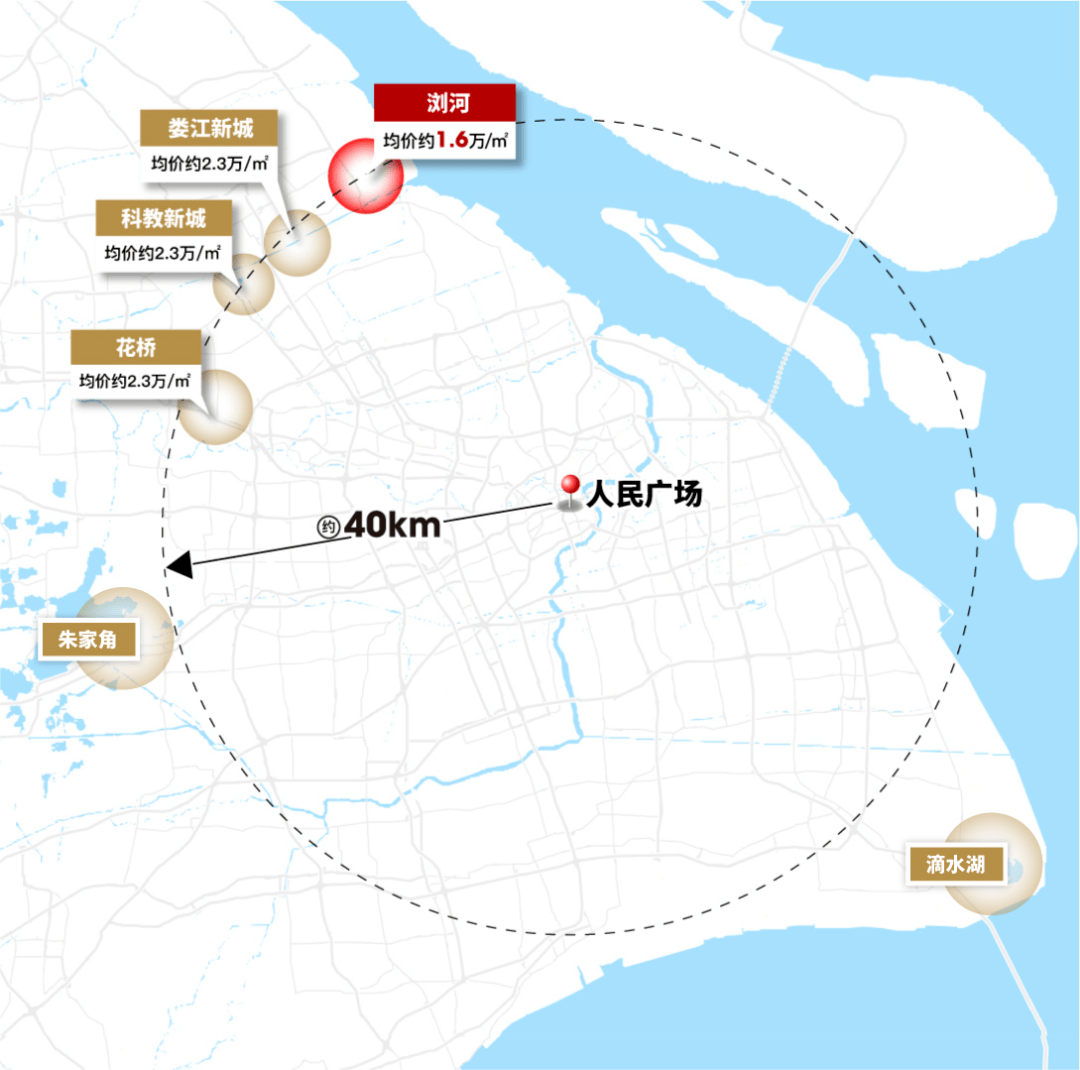 换个角度看,40公里范围内涵盖的环沪城市只有昆山和太仓,这其中浏河板块,约16000元/㎡的性价比,无出其右。