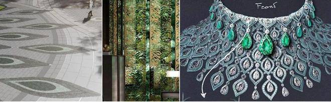 祖母绿切面工艺铺装、蓝宝石水景、琥珀质感格栅……宝石灵感贯穿景观细节,香槟金“飘带”外立面与蝴蝶状曲线建筑群,在晨昏光影中与黄浦江波光共舞。