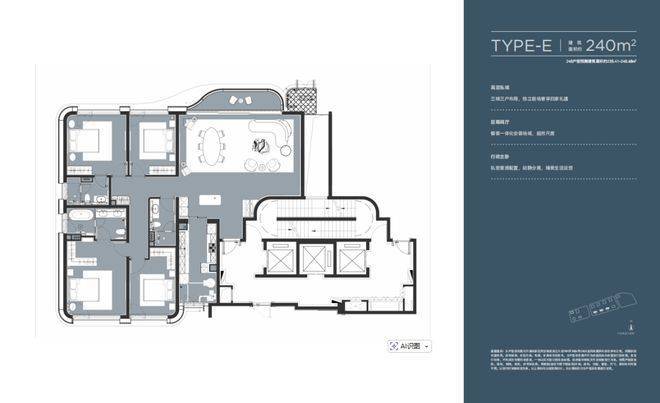 拥有超16米景观面宽,搭配8米以上巨幕横厅和飘带般向外延伸的弧形阳台,甚至跨级超越了传统388㎡户型的观景尺度,在滨江众多200-300㎡产品中,可以说没有对手。
