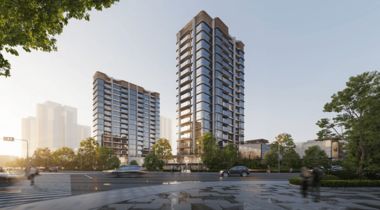 在建筑设计上,GOA大象设计跳出常规住宅的方盒子形态,以徐汇作为中国现代音乐发源地的文化基因为灵感,将“乐器王后”大提琴的优雅弧线,转译成建筑立面的二维曲线语言
