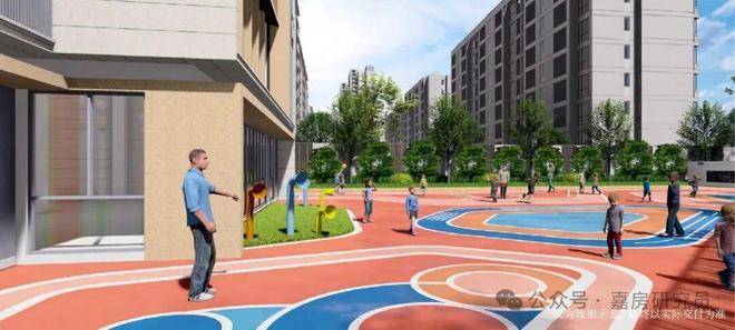 乐园”主题游乐场,采用13cm彩色厚塑胶铺装,以童趣跑道串联低龄&高龄儿童活动区,以及家长看护区,更特设婴儿车位。