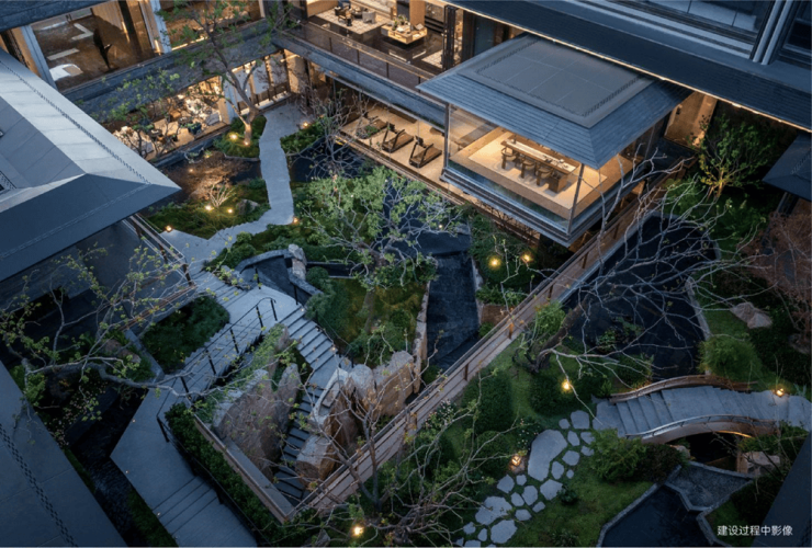 而最令人惊艳的,当属约6米地势差打造的下沉式山水庭院,山、石、水、林有序交织,犹如一幅“豁然开朗”山水轴卷,每一步皆是景致,每一处皆有不同。