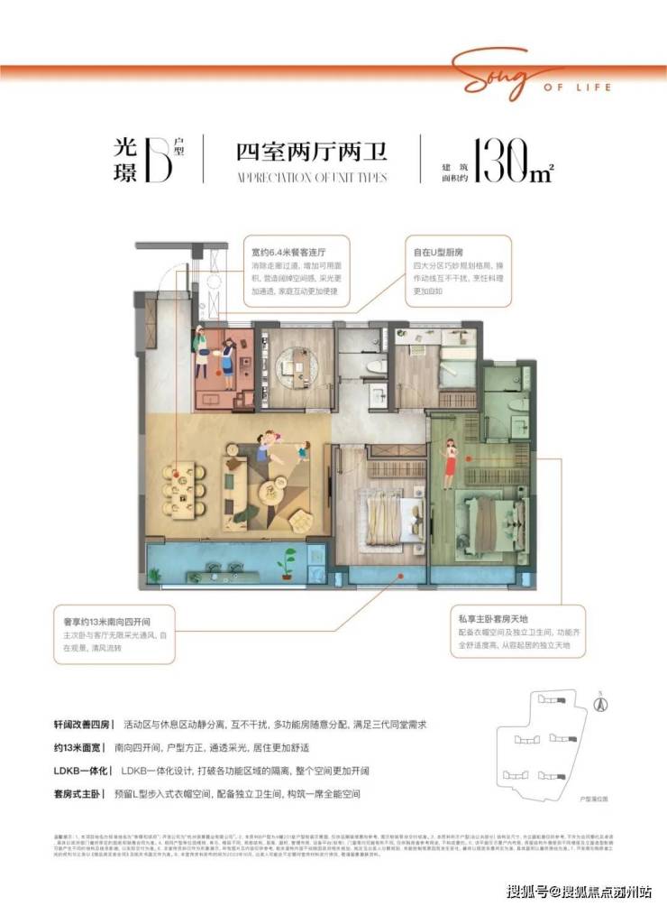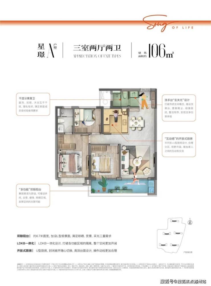 约106㎡户型点评:双联阳台约6.7米面宽,加设L型俯景面,满足晾晒、赏景、采光三重需求,LDKB一体化设计,打破各功能区域的隔离,整个空间更加开阔,开放式厨房U型厨房,封闭敞开随心切换,高效台面设计,操作动线更加合理!