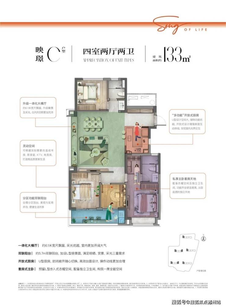 约133㎡户型点评:约6.1米宽尺飘窗,采光优越,室内更加开阔大气,约5.7米双联阳台,加设L型俯景面,满足晾晒、赏景、采光三重需求,U型厨房,封闭敞开随心切换,高效台面设计,操作动线更加合理,预留L型步入式衣帽空间,配备独立卫生间,构筑一席全能空间!