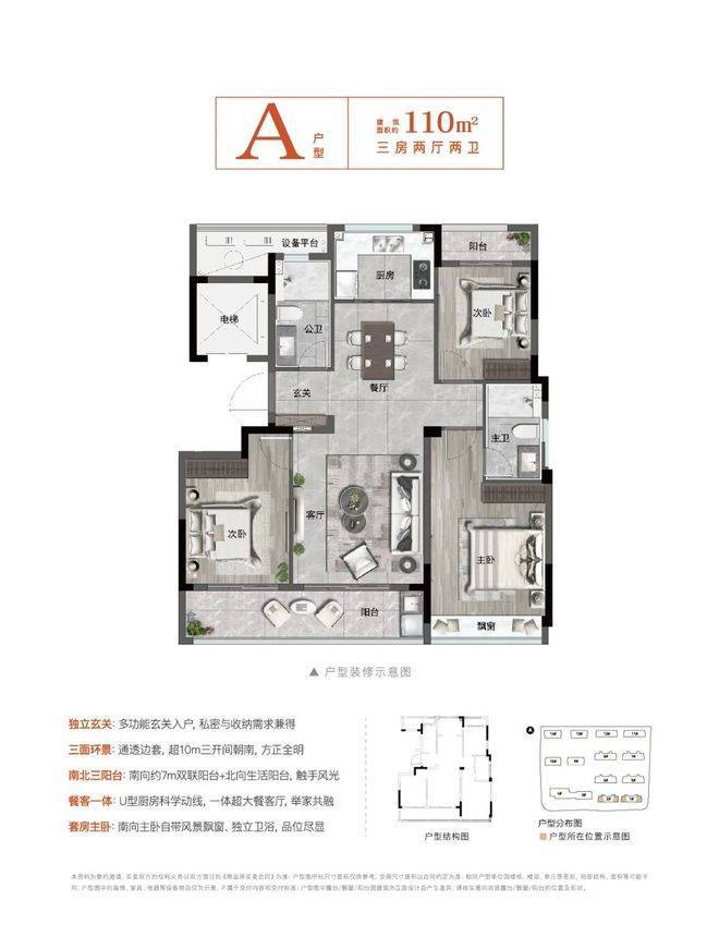 约110㎡户型点评:独立玄关:多功能玄关入户私密与收纳需求兼得,三面环景:通透边套,超10m三开间朝南,方正全明,南北三阳台:南向约7双联阳台+北向生活阳台,触手风光,餐客一体:U型厨房科学动线,一体超大餐客厅,举家共融,套房主卧:南向主卧自带风景飘窗、独立卫浴,品位尽显