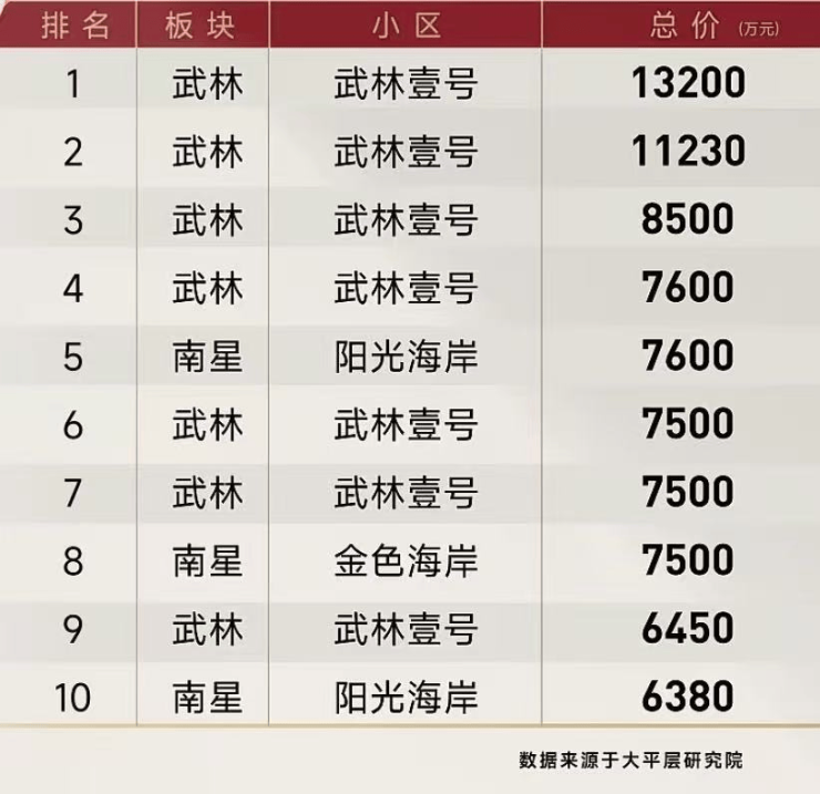 2024年杭州二手房成交榜单TOP10