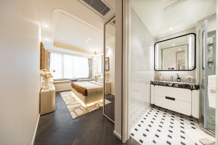 就连玄关柜、客厅收纳柜、阳台柜、主卧衣柜以及客厅背景墙、主卧背景墙也都全部纳入交付标准。这样的配置,交房后只需再配点软装,就可以直接入住。