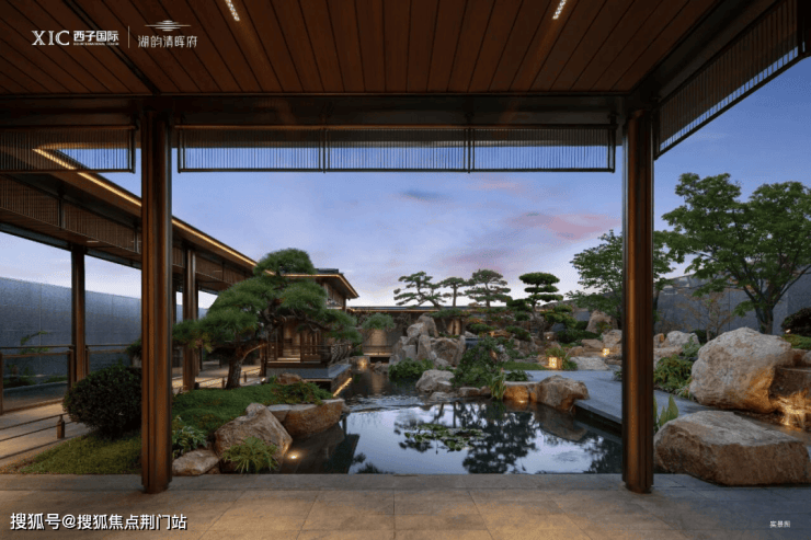 于门庭处,湖韵清晖府不惜重金,打造了一座“松石之园”,园内四株造型黑松错落有致,周边更辅以约400吨太行金原石、叠瀑及一整面巴西铂金钻奢石影壁,共同营造出松石映趣的奢雅意境。